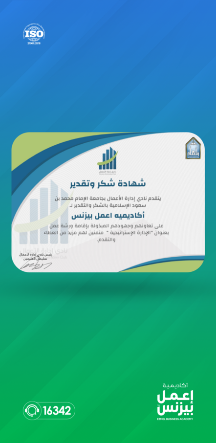 وقد تشرفت أكاديمية "إعمل بيزنس" وأ. منى القصاص بالحصول على شهادات تقدير من نادي إدارة الأعمال بـ"جامعة الإمام محمد بن سعود الإسلامية"، وذلك تقديرًا على جهودهما المبذولة في تقديم الورشة، التي كانت على درجة عالية من القيمة والجودة لكافة الحضور.